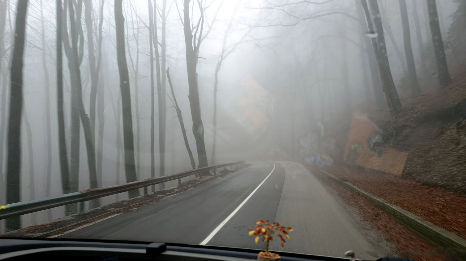 On s’engage sur une route de montagne et on est vite complètement entouré par le brouillard.