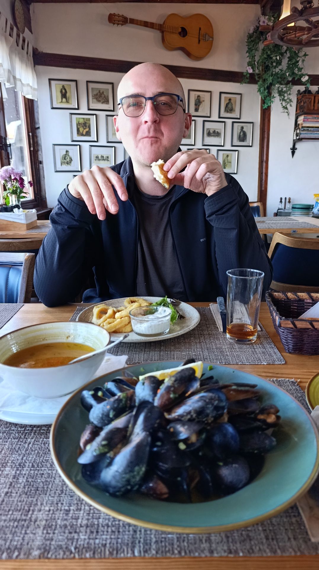 J’y mange une bonne soupe de poisson et des moules. Jc lui se laisse tenter par des calamars frits. On avait peur de l'attrape touriste. Mais au final le rapport qualité-prix est bon.
