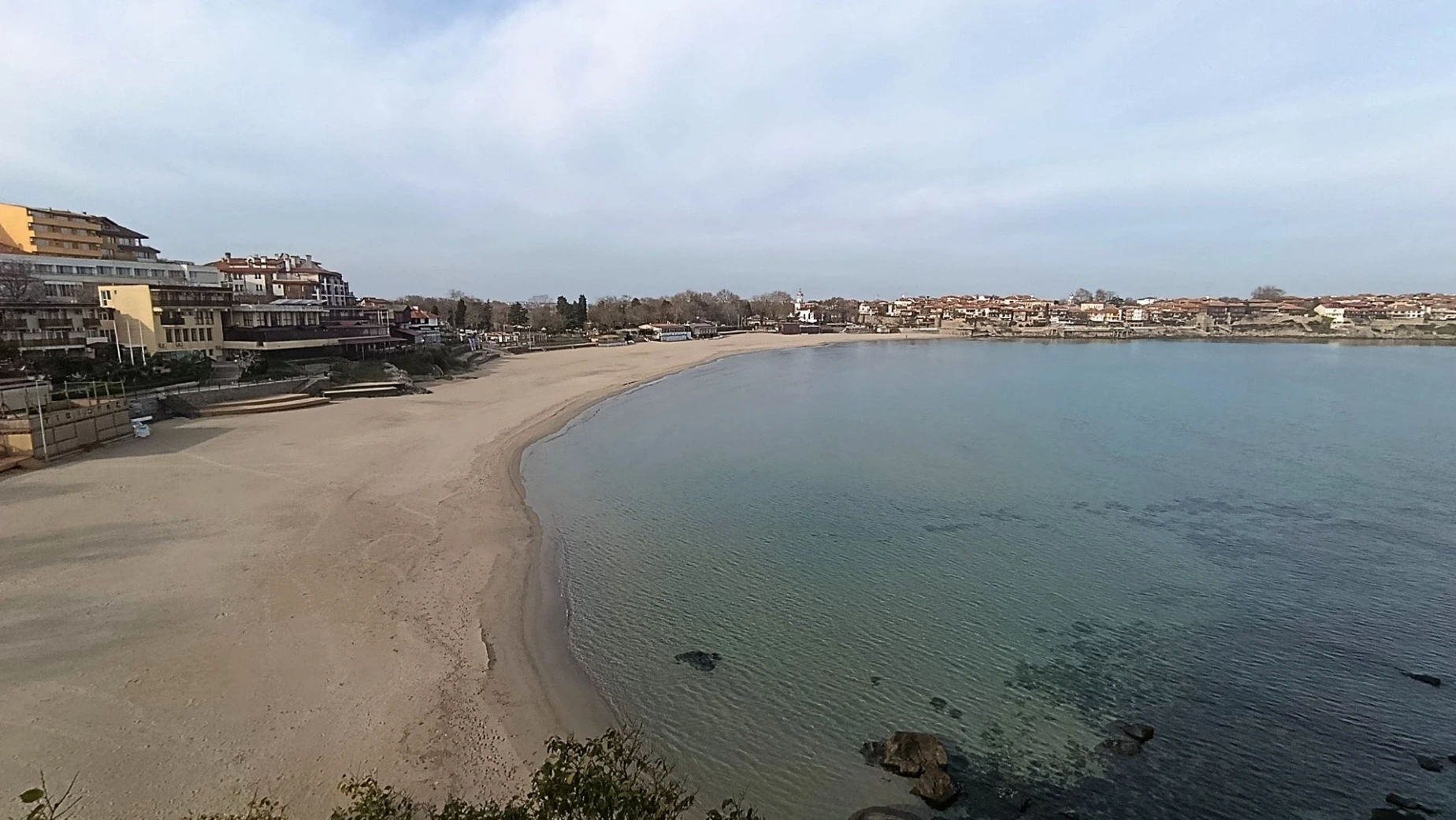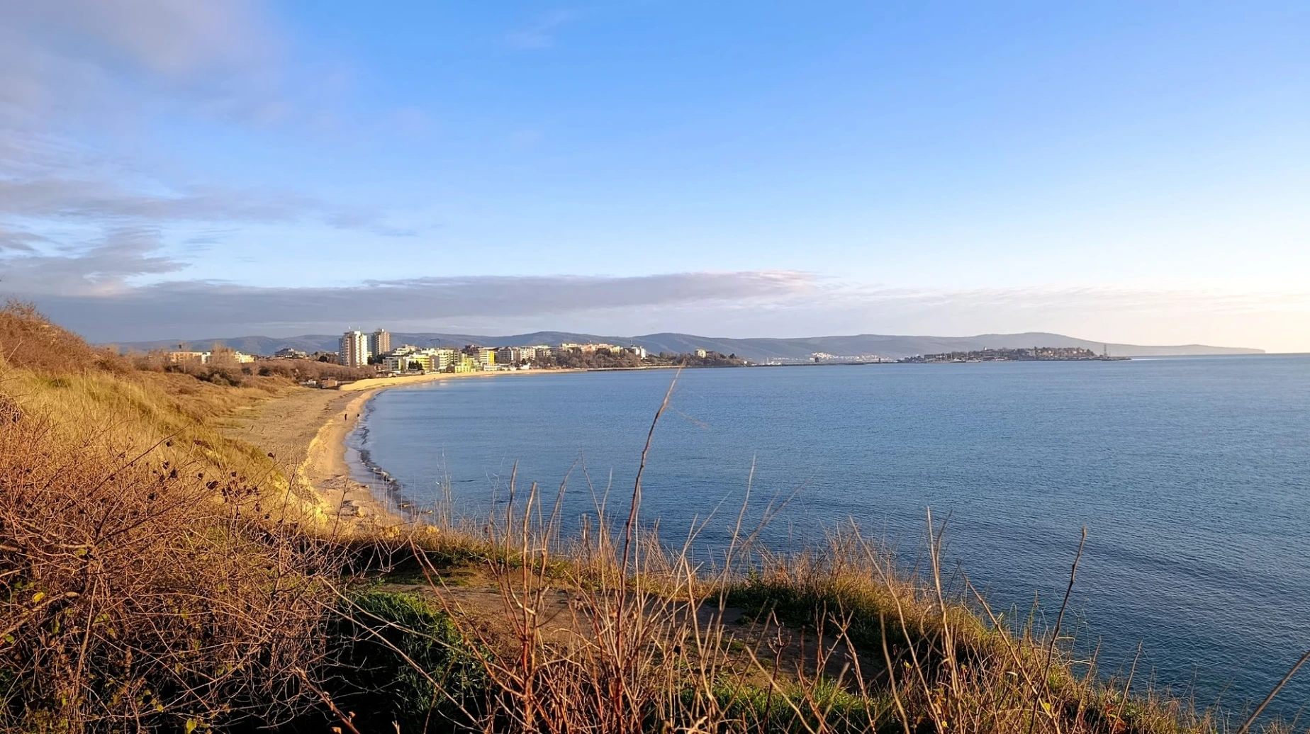 On choisit ce P4N (#126393) gratuit en hors saison pour se garer. Puis nous marchons jusqu’au centre ville. Même constat qu’à Nessebar, l’endroit est désert. Mais j’adore la vue sur la baie avec la vieille ville en fond. La plage est très grande et je ne doute pas que cela doit être "the place to be" en été.